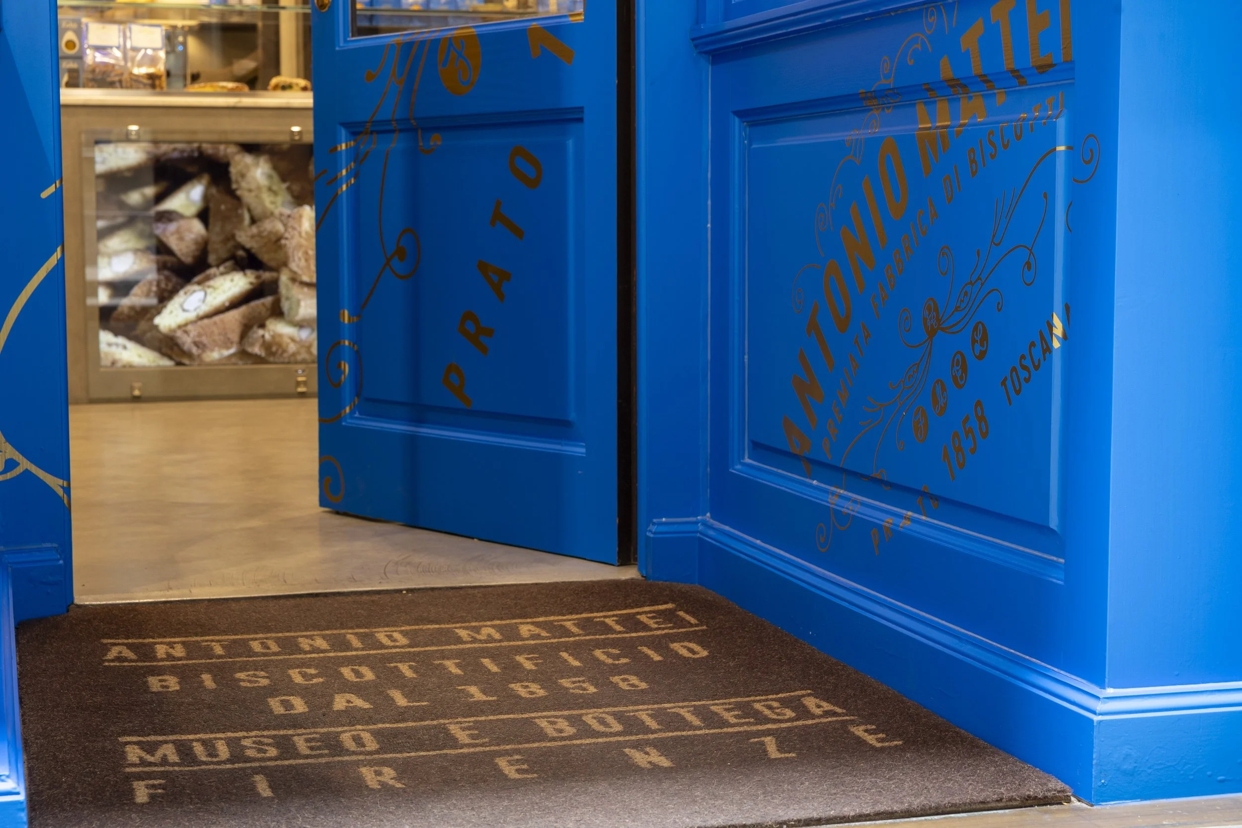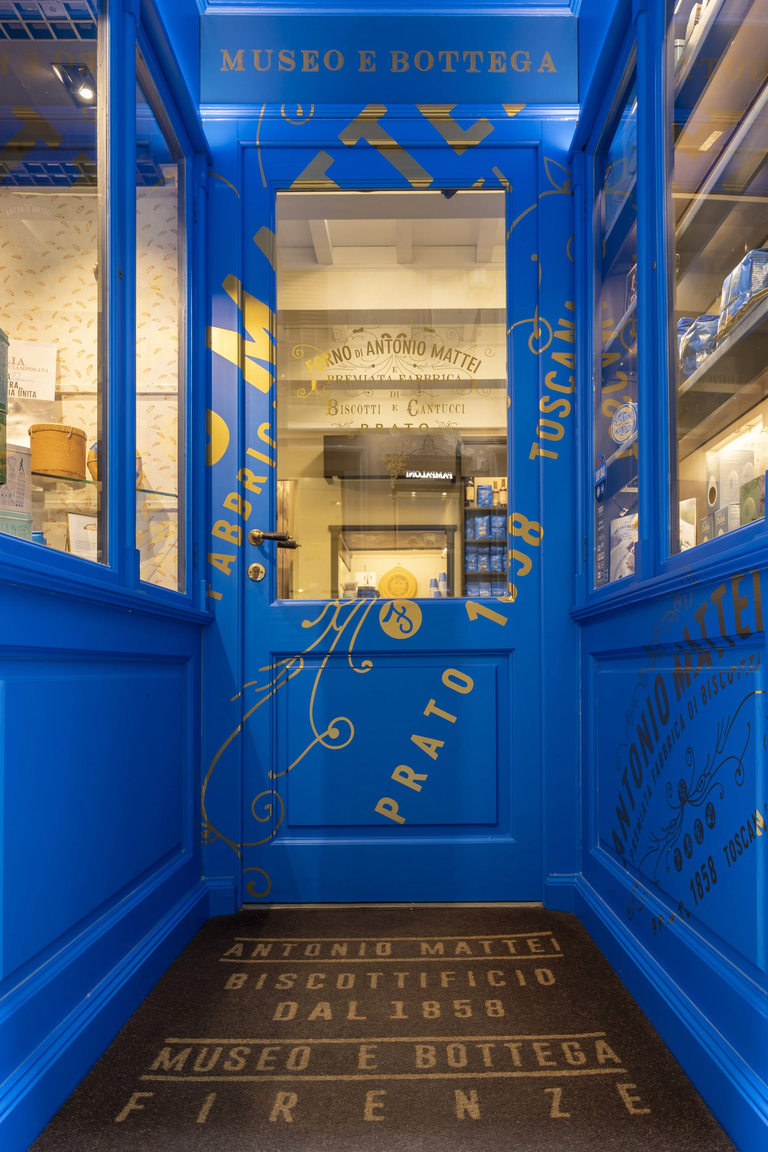 Mi piace pensare che nel lavoro di comunicazione che conduco sul Brand siano sempre due gli elementi cardine: la composizione e la sua utilità, la contaminazione e la sua emotività. Elisabetta mi ha chiesto di pensare a qualcosa che riuscisse a caratterizzare il Museo Bottega di Firenze, qualcosa che legasse maggiormente non solo il luogo fiorentino al Laboratorio storico di Prato ma che dialogasse direttamente con la strada storica di Porta Rossa e i suoi passanti. Ricordo di aver immaginato proprio questa cosa: ‘Vorrei che fosse un’immersione nel Blu ma disorientante come l’arrivo di Alice nel Paese delle Meraviglie’. Dopo aver scartato diverse ipotesi l’idea che più mi incuriosiva e motivava era quella che prevedeva un lavoro su due livelli: il colore e il concetto. Il primo è stato l’elemento naturale ed intuitivo, il conseguimento di un processo già avviato da tempo. Da otto anni infatti per me curare il packaging del Biscotto di Prato è stato come prendermi cura della sua ‘seconda pelle’. In questo caso disegnare la proposta della facciata dell’ingresso del Piccolo Museo è stato un po’ come scegliere un nuovo abito. Il concetto che si è sovrapposto all’iconico Blu Mattei è nato da un pensiero sulla ‘dismisura del reale e del gioco’ e ho deciso di decostruire il Logo per renderlo puro elemento decorativo. La proposta è stata accettata e condivisa, grazie poi al lavoro di squadra l’idea ha preso vita. Pensando in proporzione alle dimensioni dell’ingresso di Porta Rossa e a quelle del sacchetto da un chilogrammo di Biscotti non posso che consigliare a chiunque si trovi a Firenze di passare ed intrufolarsi all’interno del Piccolo Museo per godere appieno del ‘sapore blu’.