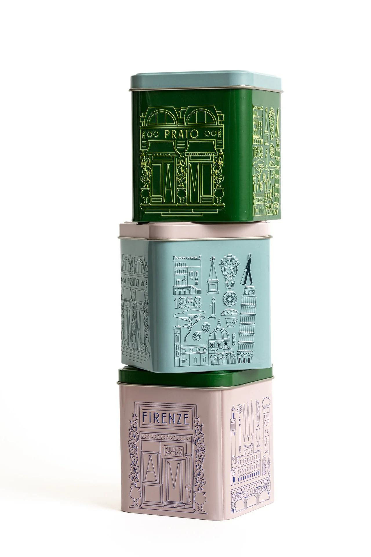 Questo cofanetto è dedicato al Piccolo Museo Bottega di Firenze. L’artwork che si sviluppa sul corpo laterale della latta è caratterizzato da particolari propri dell’ambiente museale di via Porta Rossa 76/R, il salotto fiorentino inaugurato nel 2018. Tra le cornici dorate raffigurate troviamo alcuni personaggi reali come il fondatore Antonio Mattei e personaggi di fantasia ispirati a uomini e donne di tutti i giorni. Alcuni ritratti descrivono esattamente l’animo e il carattere di soggetti divertenti che popolano i ricordi e gli archivi fotografici del Biscottificio Antonio Mattei.